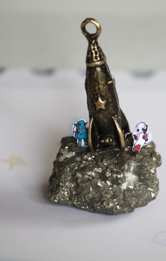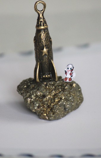 そして、宇宙関連ネタとパイライト(黄鉄鉱)の相性の良すぎることといったら。手持ちのパイライトすべてに、このロケットとマイカ嬢をつけてしまいそうになりましたが、かろうじて自重しました(やっていいと誰かに言われたら即やってしまいそうなレベル)。一応、水晶、煙水晶、瑪瑙版も作ってみるつもりで、準備しています。