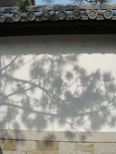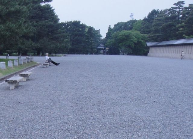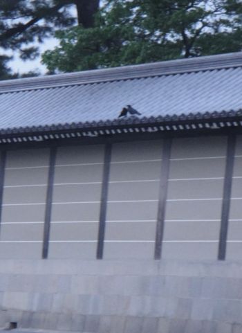 京都御所の庭を歩きながら、塀の上のカラスが仲良くしてるのを撮影するのに余念がない母。