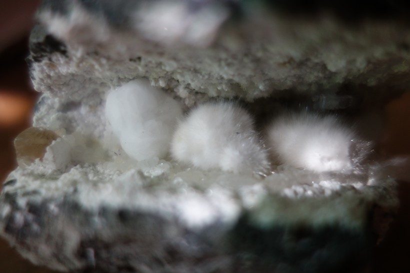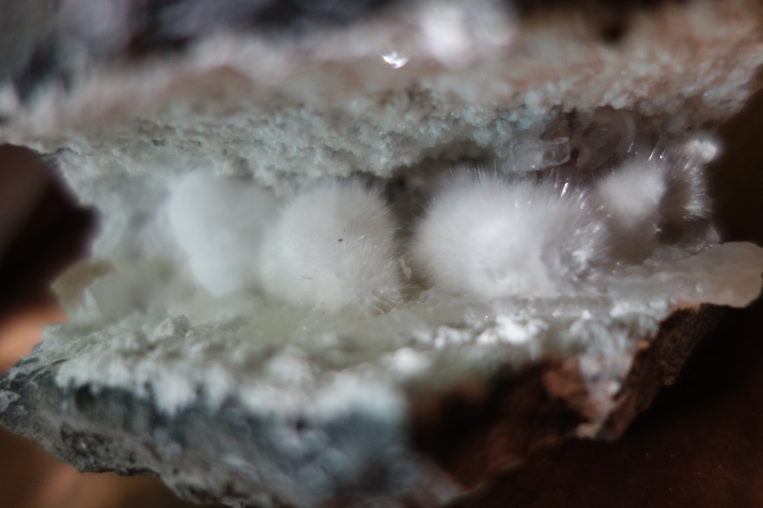 ふわふわして壊れやすいオーケン石は、つまむにも毛状結晶を破損するのが怖くて、硝子ケースに押し込むのも躊躇われるのですが、こいつは「つまみ」があったために取扱い容易で、思わずやってしまいました。つまみ……ようするに、上部の丸いギロル石ですが、オーケン石とはよく共生している鉱物です。これは十分に硬いので触っても大丈夫。ギロル石にこんな使い道があったとは……!